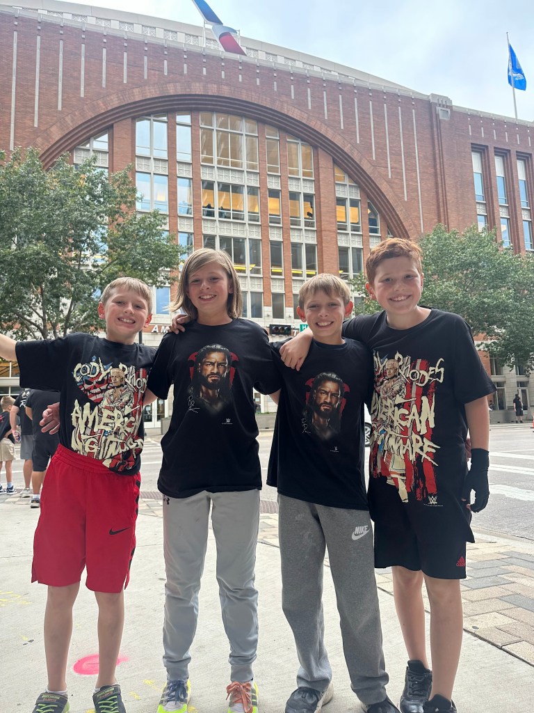 Shep and Brooks are now completely obsessed with wrestling (thanks to Hunter and Connor). They record and never miss an episode of WWE Monday Night Raw or Friday Night Smackdown! When we found out WWE was coming to Dallas 5 days before Shep’s birthday, of course we had to buy them tickets. Joe’s brother’s brother in-law (or something like that) works for WWE and was able to get him, the 4 boys, and Adam some awesome seats! Joe and Adam told the kids they were taking them to a fall church event and then surprised them in the car on the way!