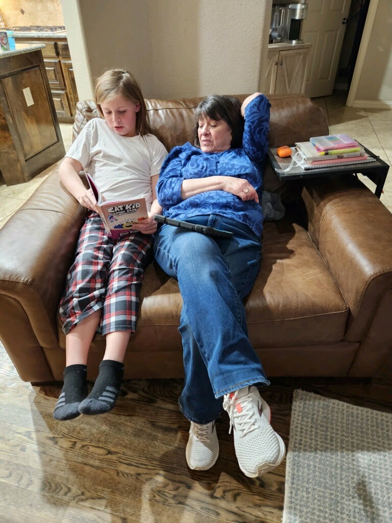 They even got to see Brooks’ basketball game the next morning, but mommy didn’t go so of course nobody got a picture. You’ll have to settle for this sweet one of poor Memaw listening to Brooks read an ENTIRE book to her before bed, lol!