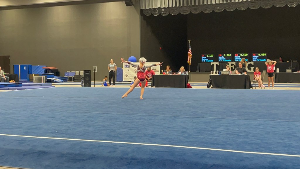 Sunday was Ellis’ 3rd gymnastics competition in Tyler, TX (2 hours away), and it didn’t start until 5pm! Her first event was vault. Not her best, but she hates vault.