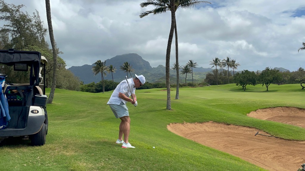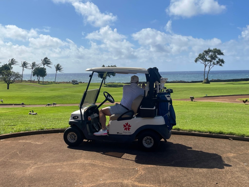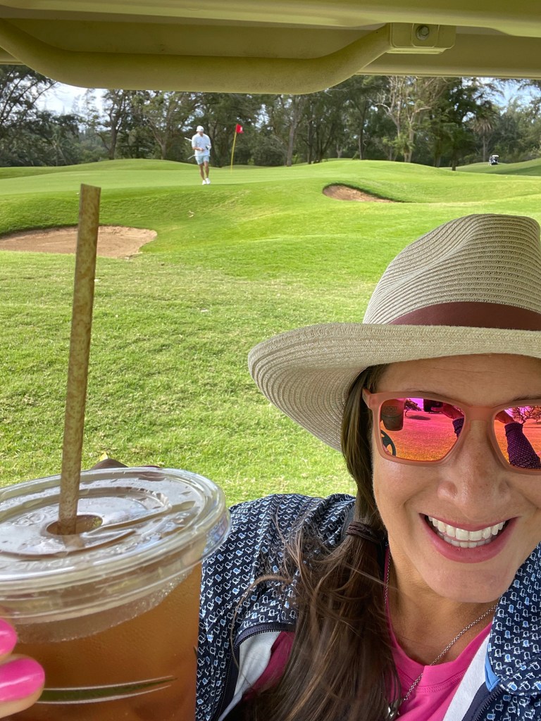 No luggage, no problem! I can ride in the golf cart in my dirty and comfy airplane clothes from the day before, while Adam plays golf!