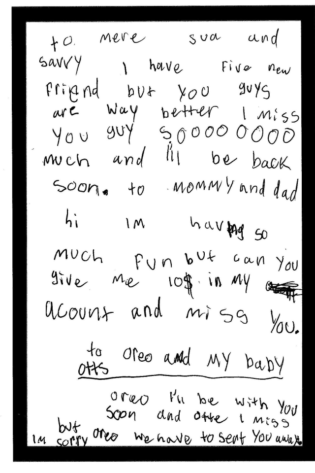 I thought Ellis would like a letter from her friends and the dogs, so our second letter to her was from them. This letter is writing back to them. I love that she asked for more money and threw in an “I miss you” for good measure, lol. We also talked about sending Oreo to obedience camp, so that’s what she means about having to send him away.