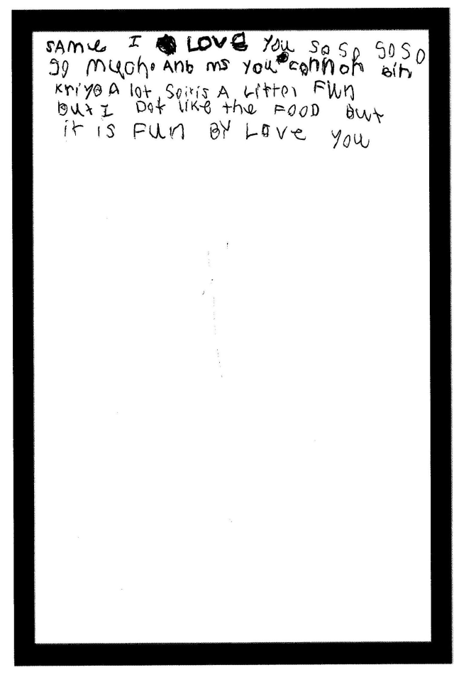 Hi mom, I’m having fun. I miss you so so much. I love you so much. I will see you. I don’t want to come home. I miss you so so so so so much. I love you, and you Dad, love you too 😂
