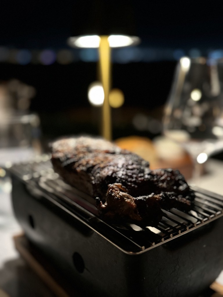 Adam’s steak came out on its own mini charcoal grill!