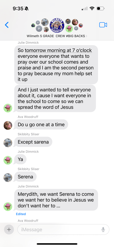 Okay another group chat that warmed my heart and I wanted to document and keep forever was Ellis telling everyone about the “See you at the Pole” national day of prayer that I helped organize at her school! And oh my goodness her response about her arch nemesis, Serena. She DOES listen to me!!