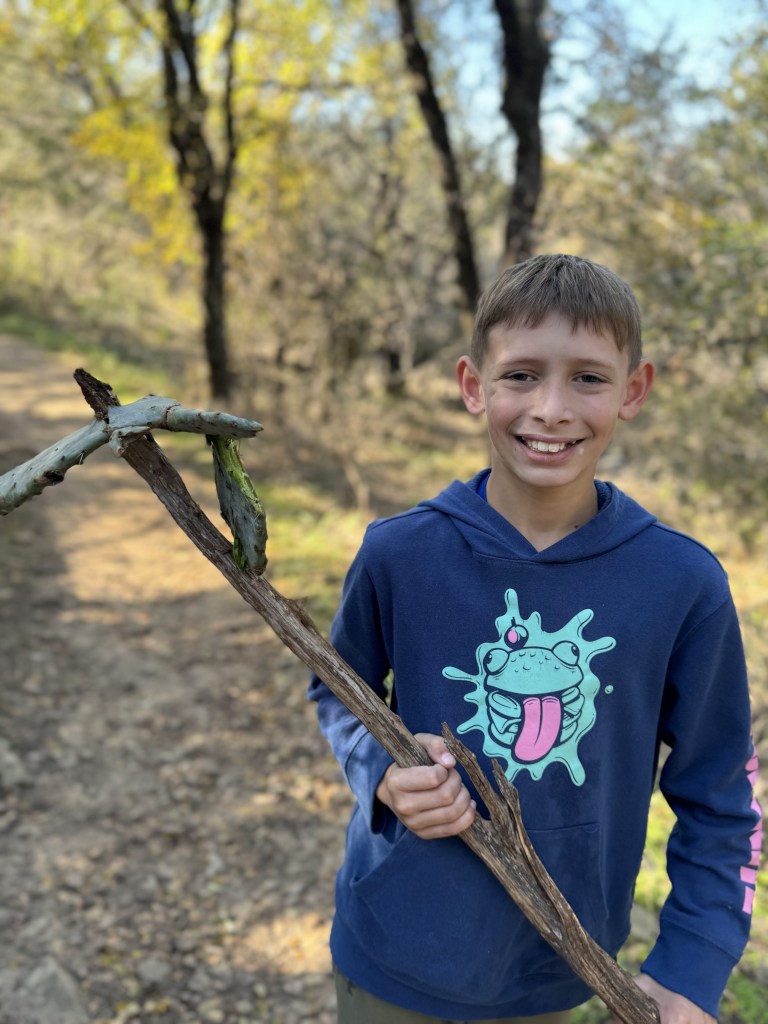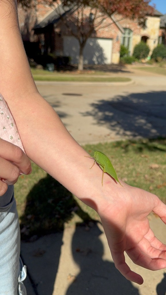 Tuesday, she was still not quite ready to go back to school. I was ordered to start walking to help me heal faster, so on I walk I went with my little sidekick! Ellis somehow spotted this leaf bug! Oh to have young eyes again…