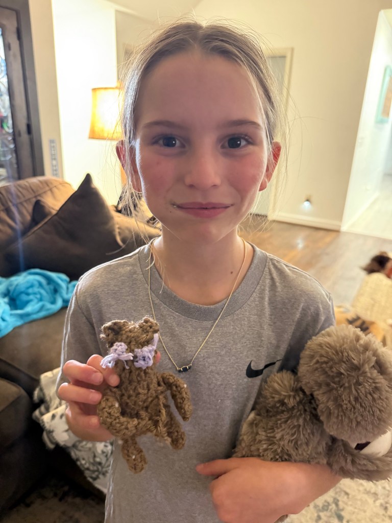 Ellis taught herself how to crochet and has gotten REALLY good at it! She free hand crocheted this little teddy bear as a gift for Maddie!