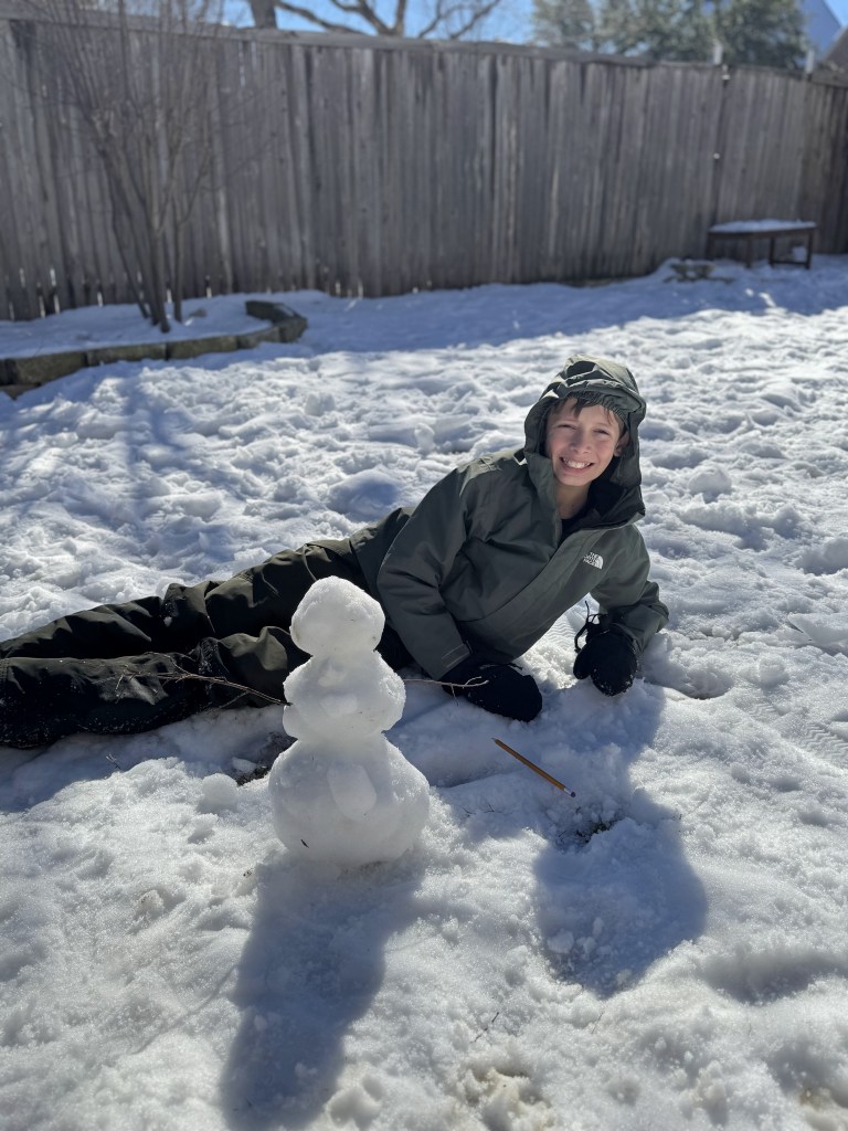 Day 3 and the snow hadn’t melted yet, so Shep had to build one last snowman!