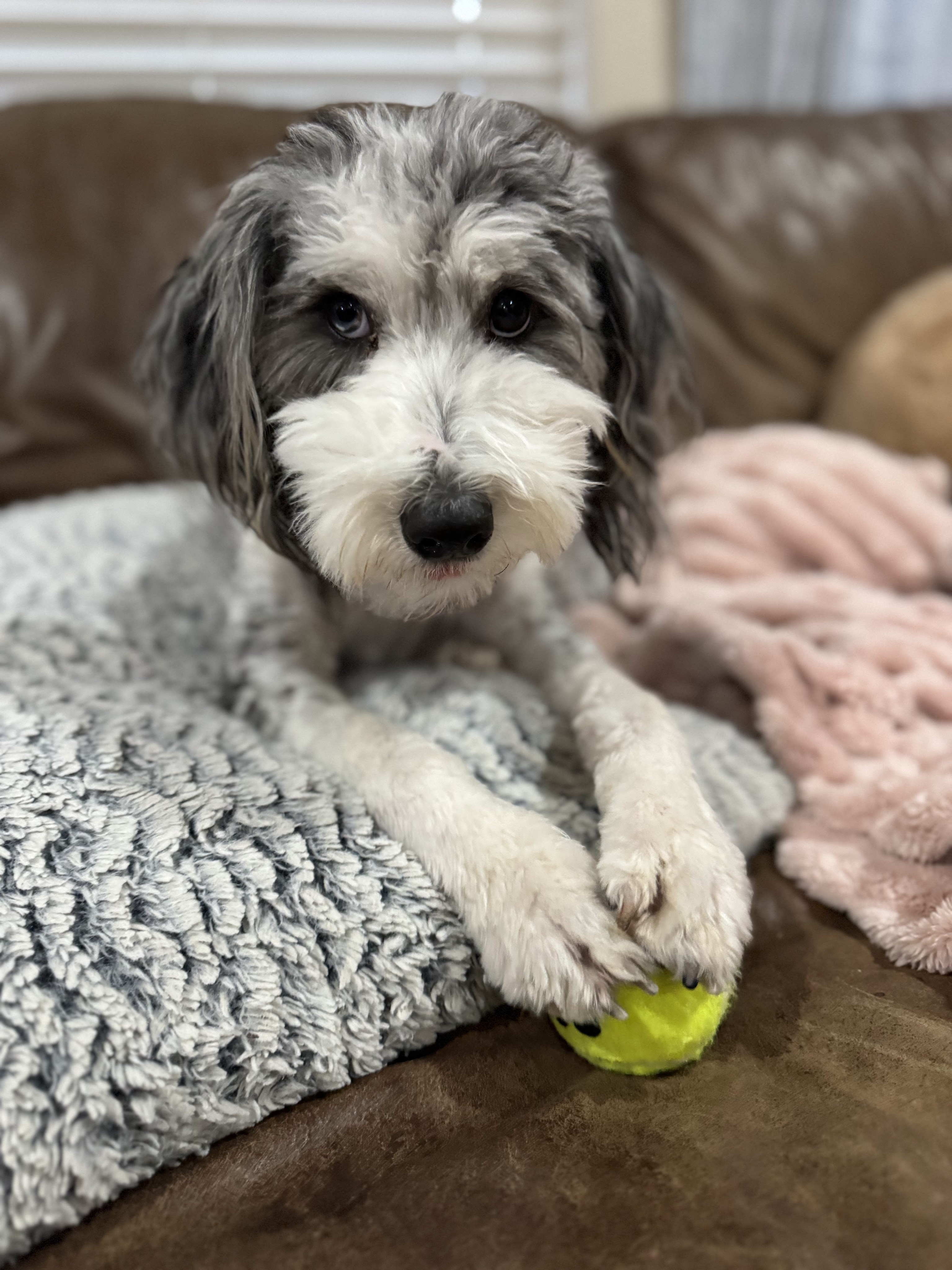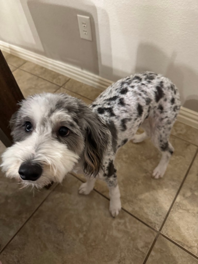 J/K….This little cutie got his first haircut and we had no idea how spotted he was! He looks like a Dalmatian, and I love it so much I think I’ll keep him trimmed! He’s not supposed to shed, but he does, and this definitely helps with that!