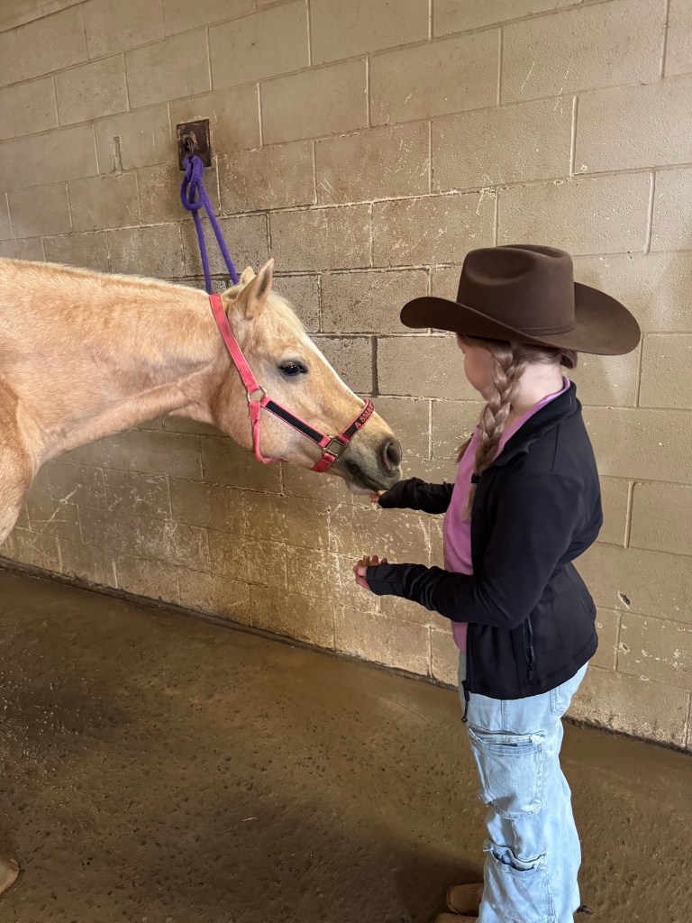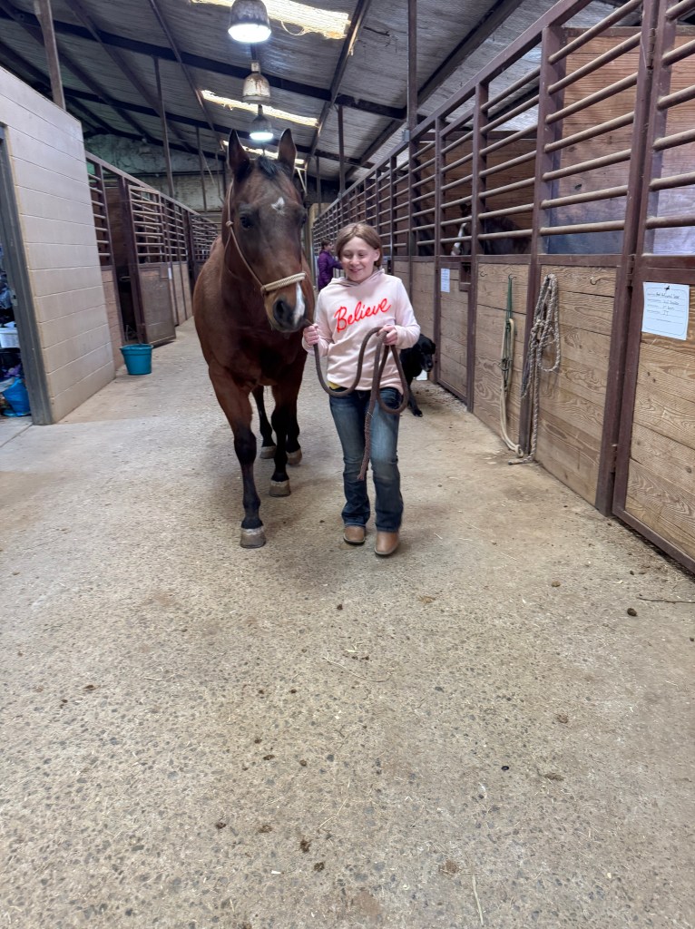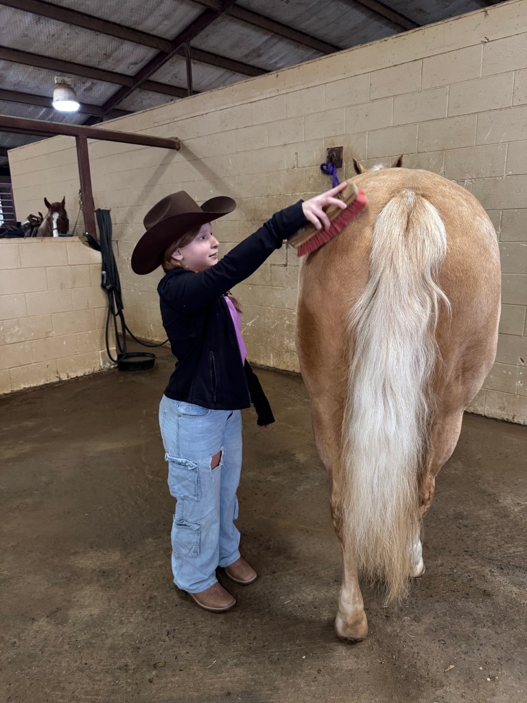 I’ve learned there are two types of horse riding competitions, Western and English. English is the one where they do the jumps and wear the high boots over the tights. Western is where they learn to control the horse more for different purposes…corralling, barrel racing, roping, etc. Ellis is learning Western for now, but might eventually get into English. They said it’s easier to go from Western (more technical) to English than vice versa.