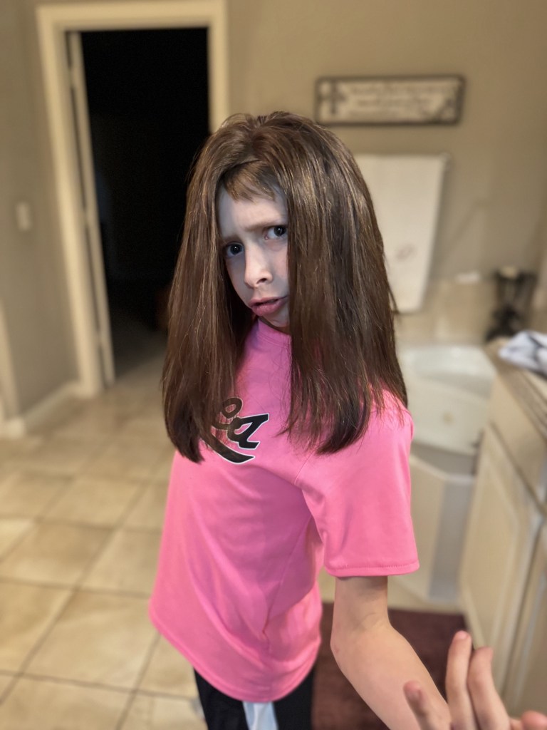 I will leave you with these hilarious pics of my little helper! I’m trying to take better care of Ellis’ wigs, and Shep puts them on so it’s easier for me to add oil to them. He’s done this for me several times. It’s a bit of a joke now, and I finally remembered to take pics, hehe!