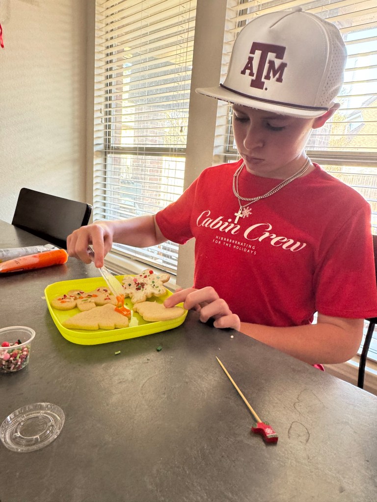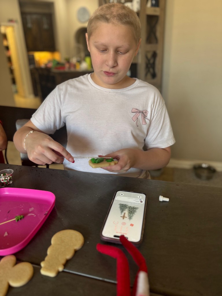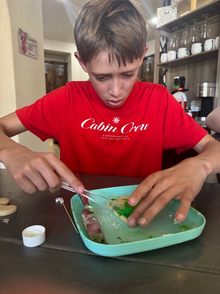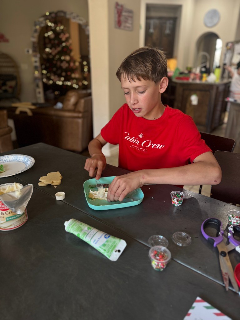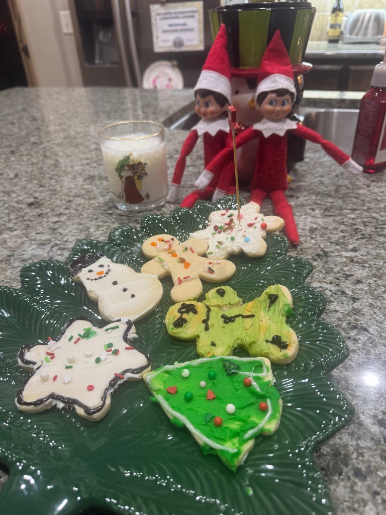 Next we listen to Christmas music and decorate cookies for Santa…