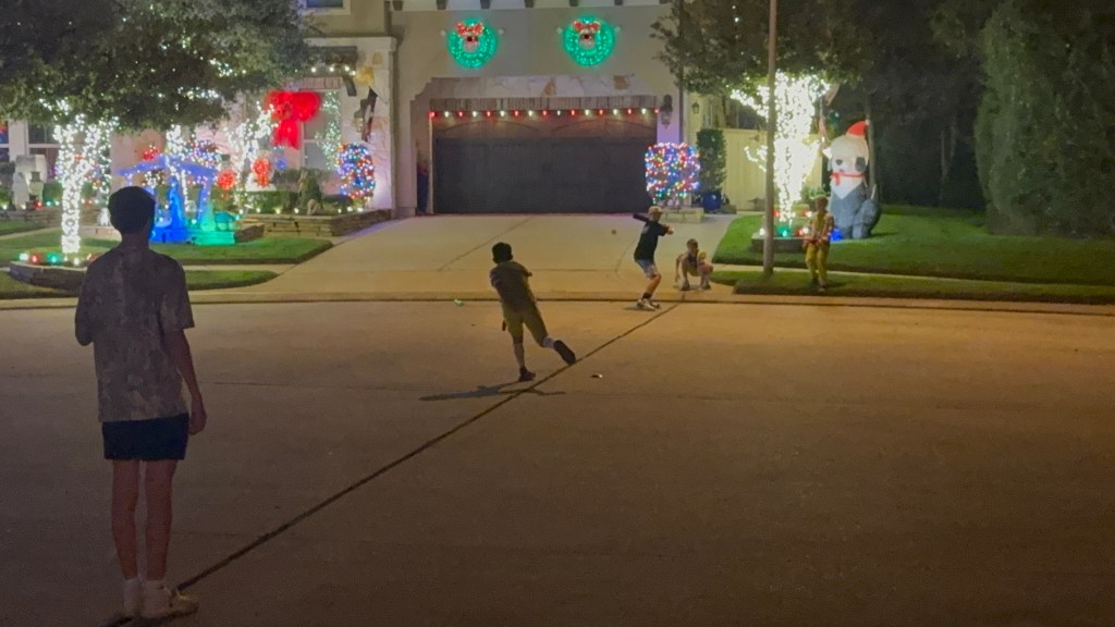 Wiffle Ball under the Christmas lights!